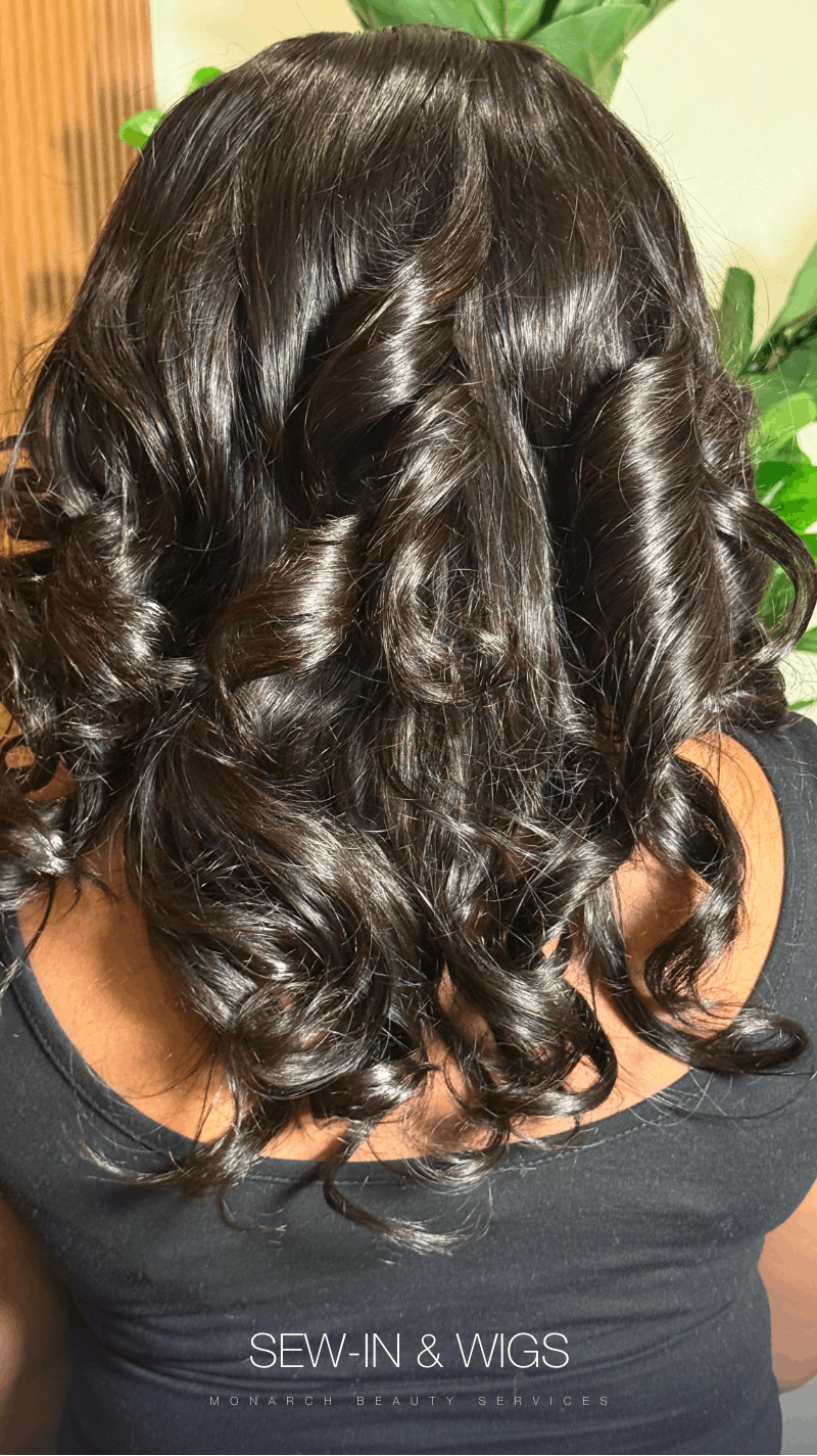 Sew-in Service: (Braided Foundation + Thread Only). A protective hairstyle where hair extensions are sewn onto braided natural hair using a needle and thread.
