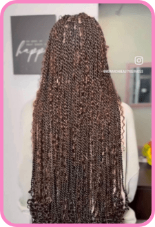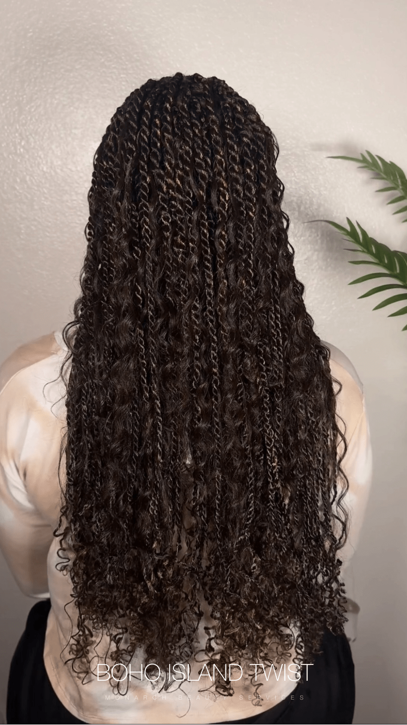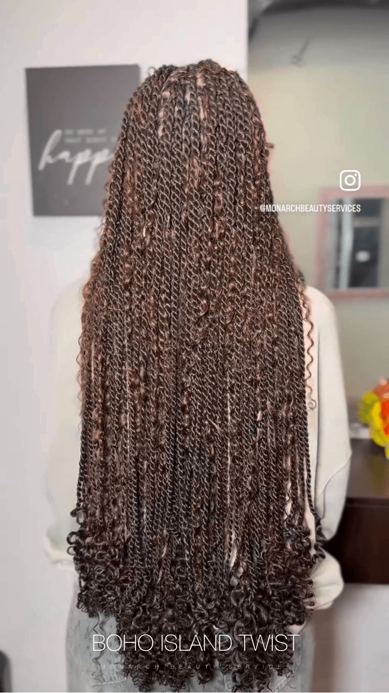 Boho island or Senegalese braid combine the protective and low-tension benefits of island twist braids with the free-spirited aesthetic of bohemian style. Curly hair extensions are incorporated in a non-uniform pattern for a more organic appearance.