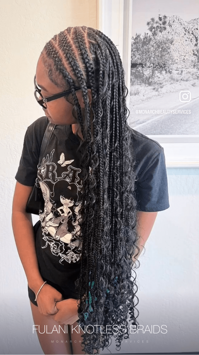 Fulani Braids are a traditional West African style that blends cornrows with free-hanging braids. Typically, the hair is braided into cornrows in the front or crown, while the rest is styled into single-strand braids or twists.