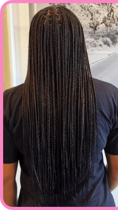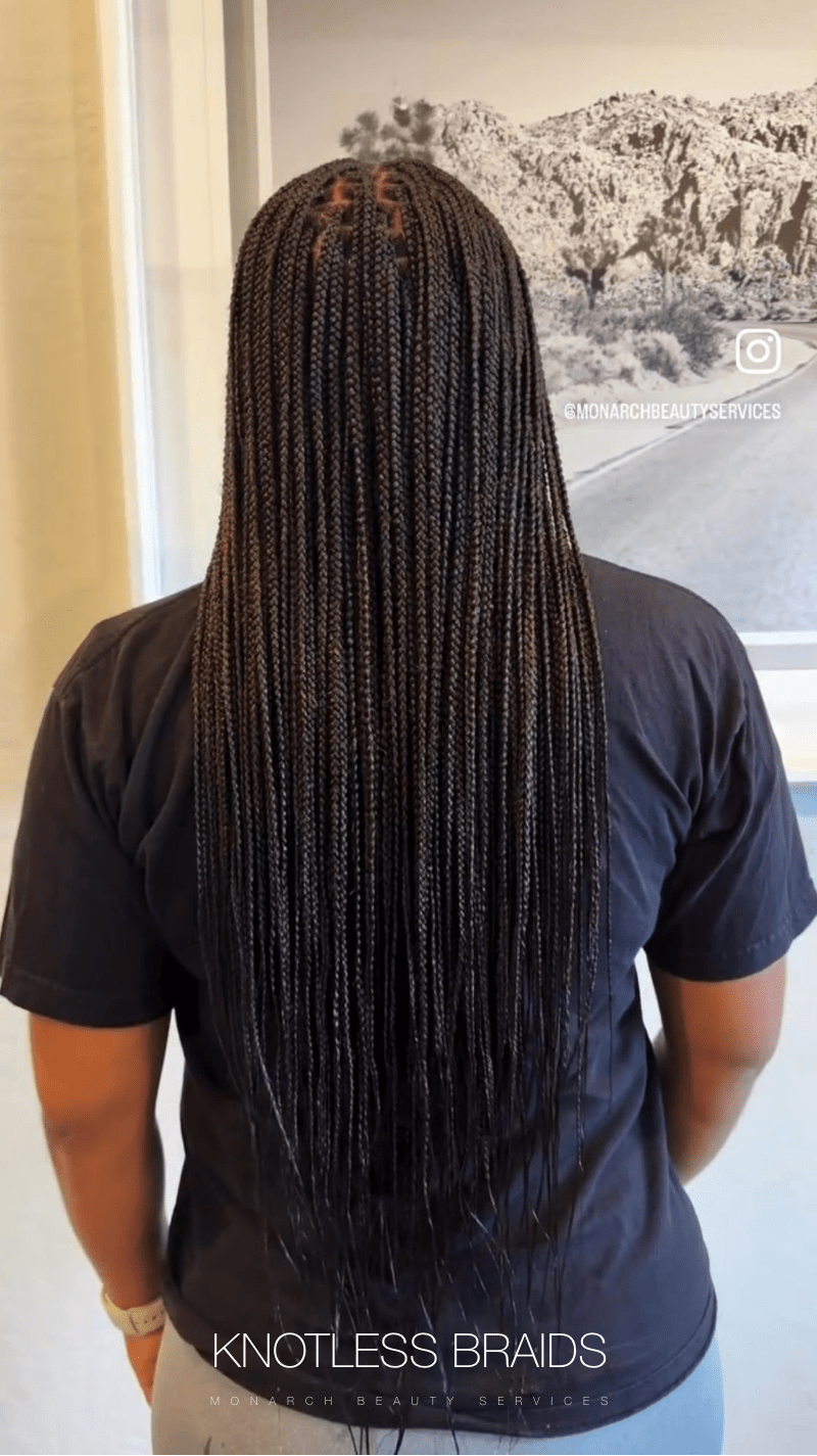 A Knotless braid is a variation of the box braid protective style that uses an alternative installation method. This technique starts by braiding the natural hair at the root, then gradually incorporating hair extensions as the braid progresses. The result is reduced tension on the scalp and a more natural look.